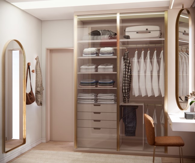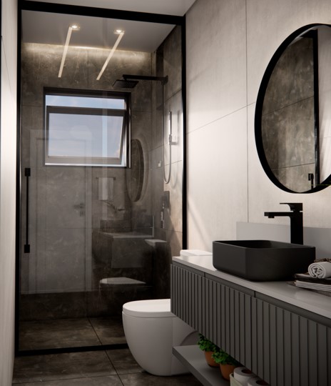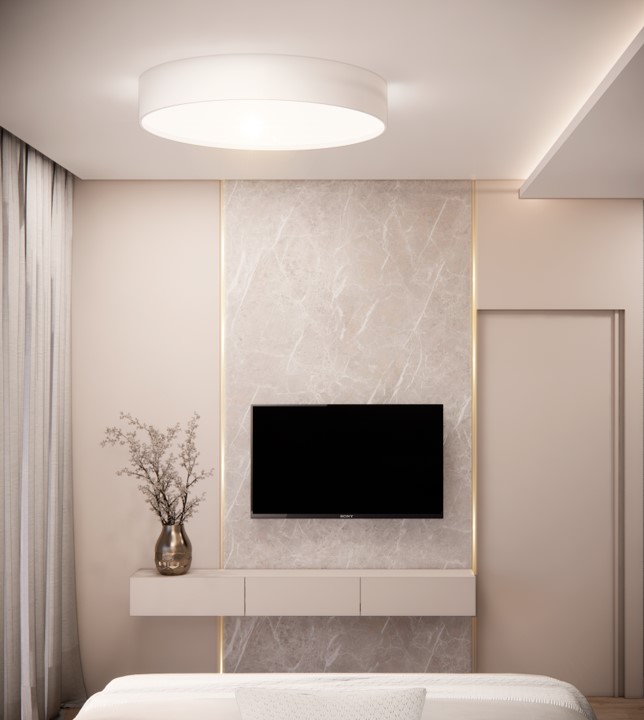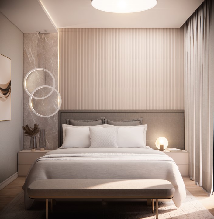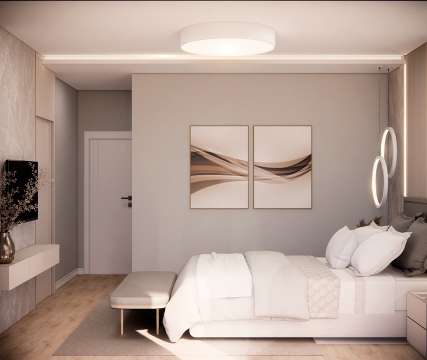 A suíte é um mar de elegância, com traços sofisticados e cores neutras, transmite a leveza necessária para um ambiente de descanso e acolhedor.